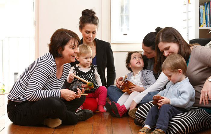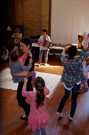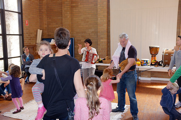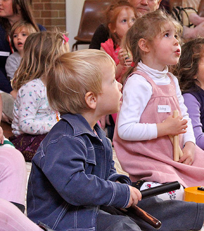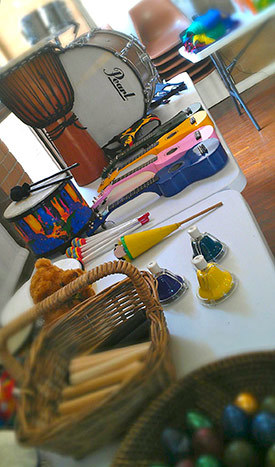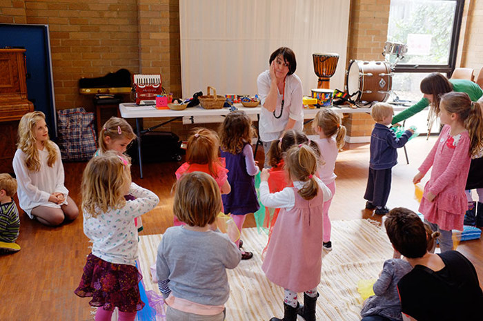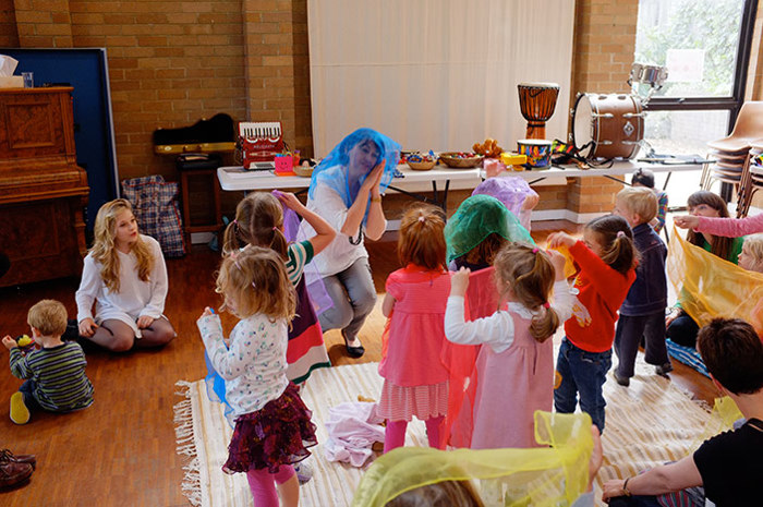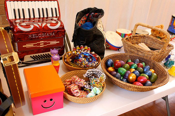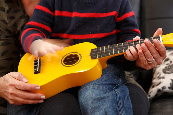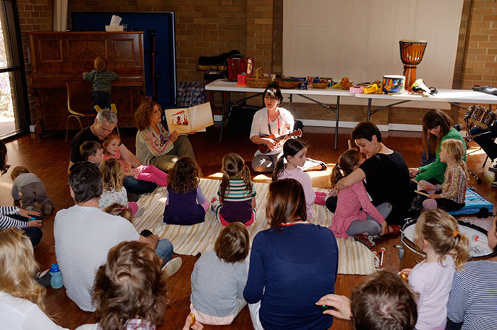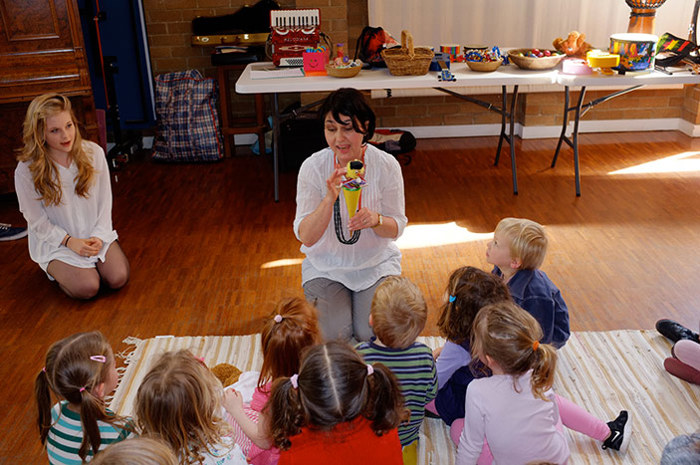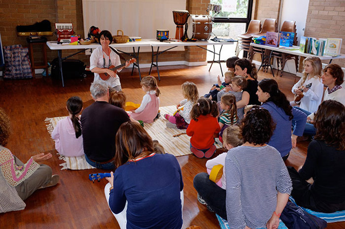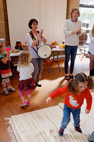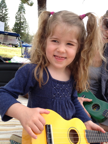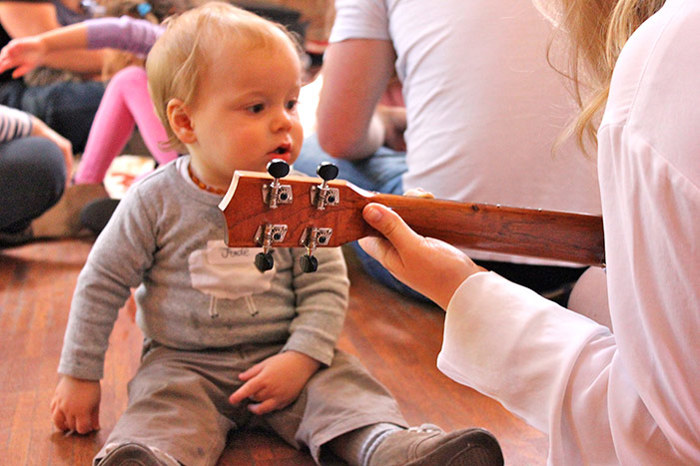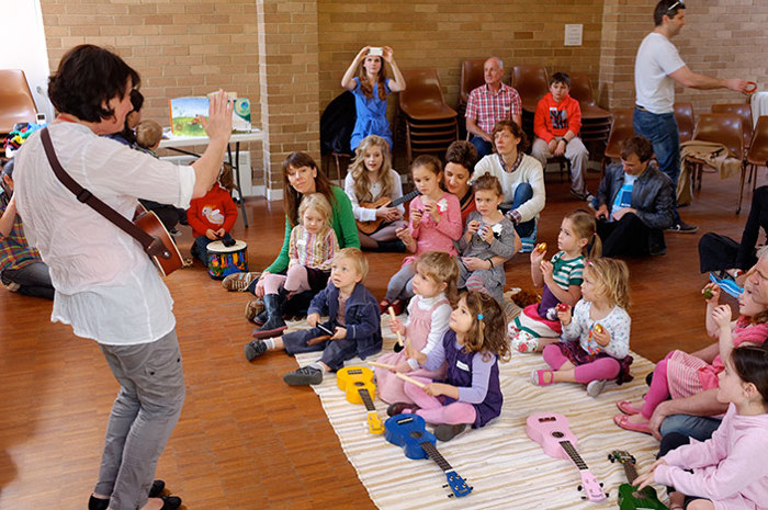 Child Care Centre-Jo and Vesma play ukulele for a child's birthday celebration